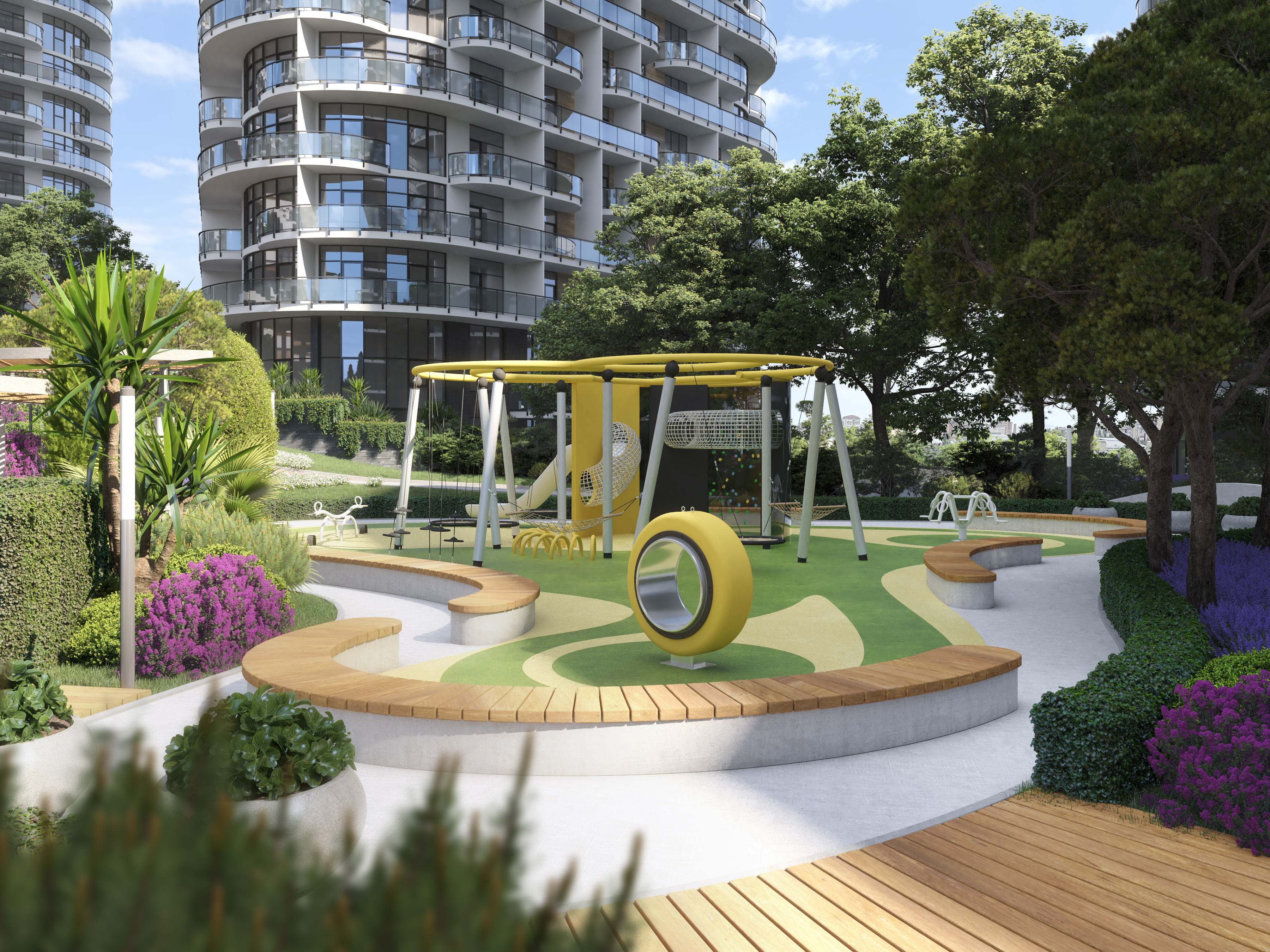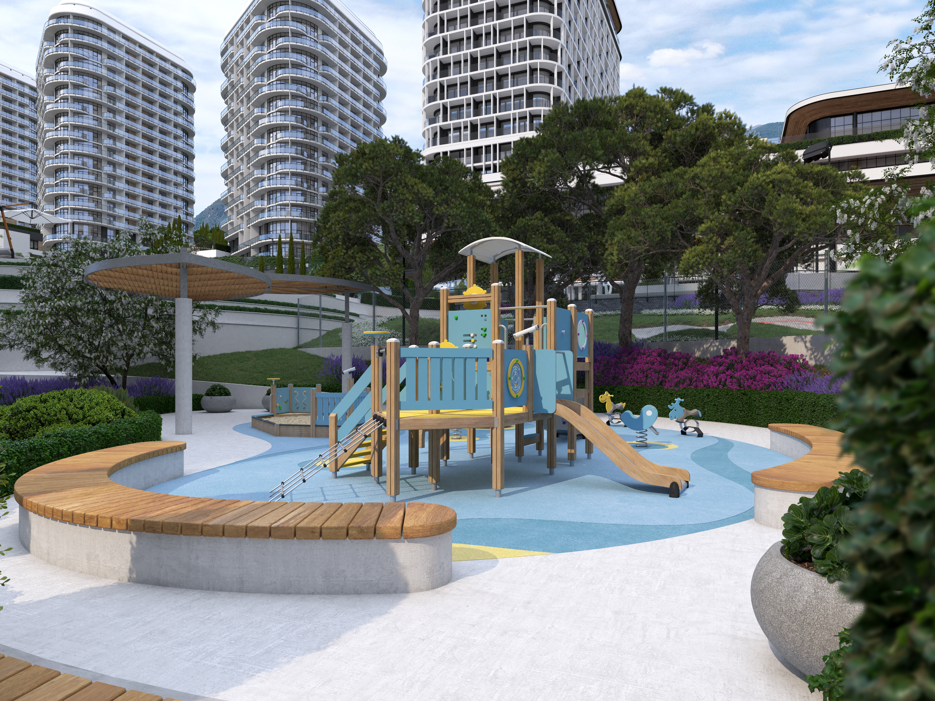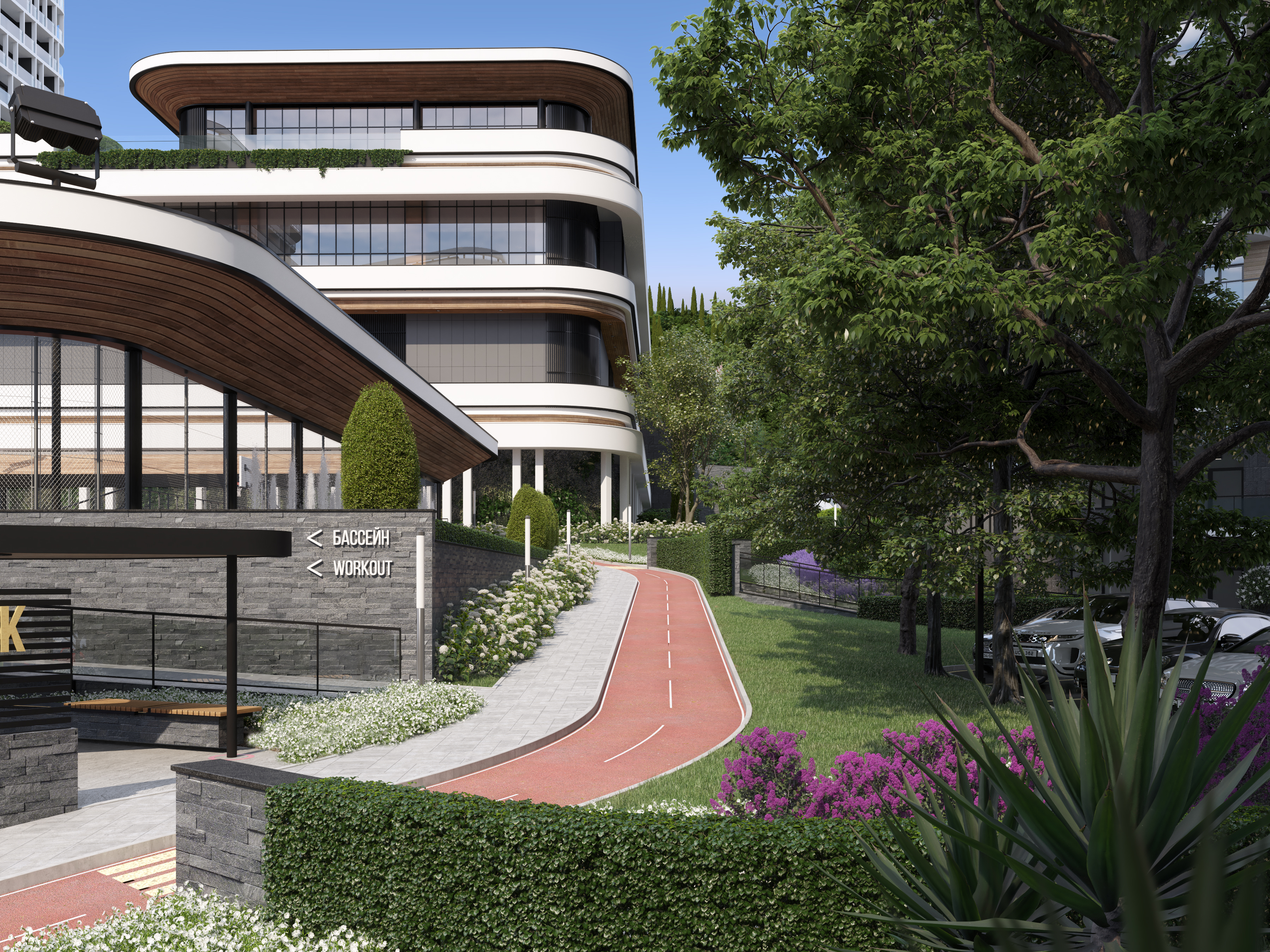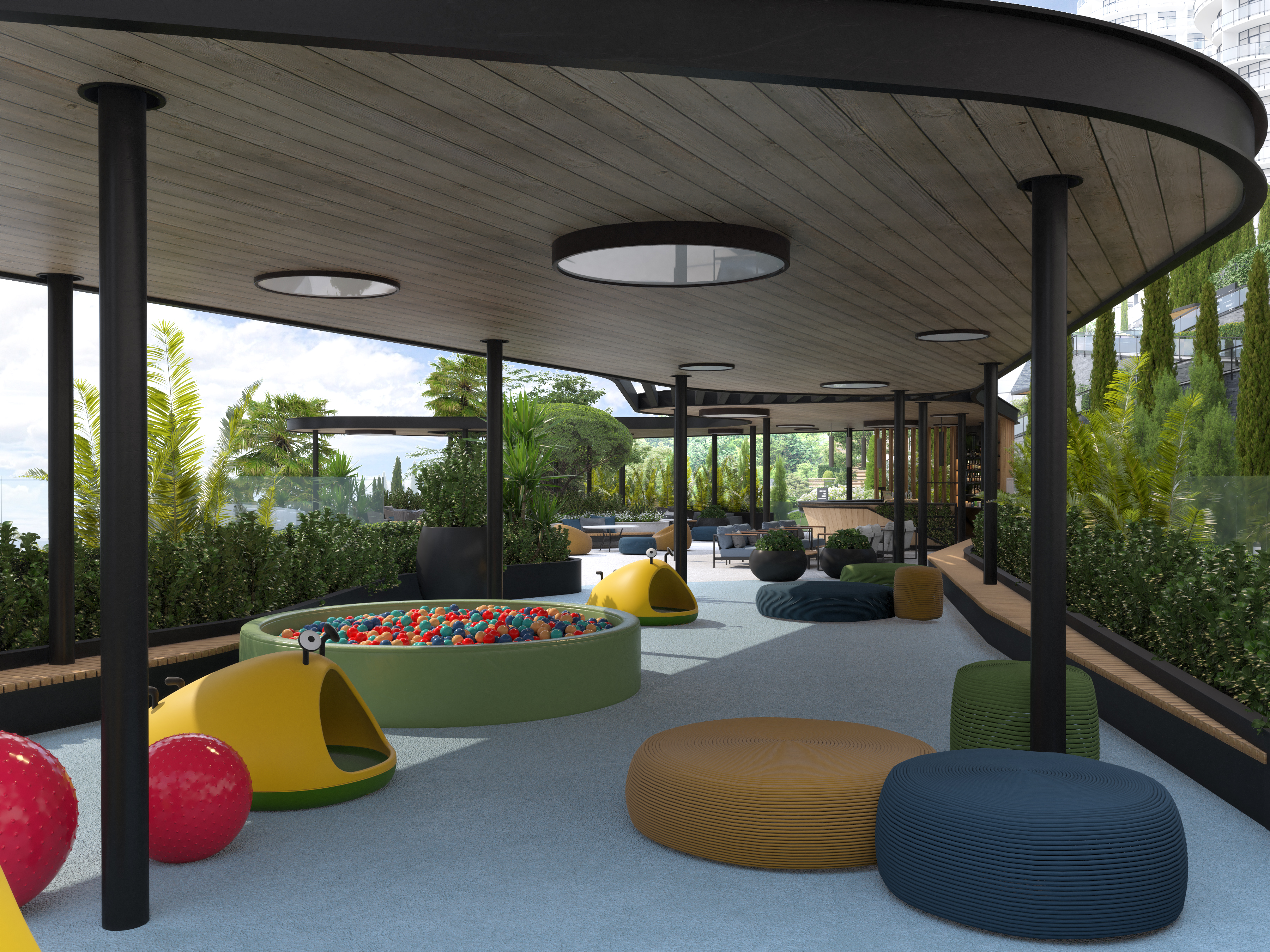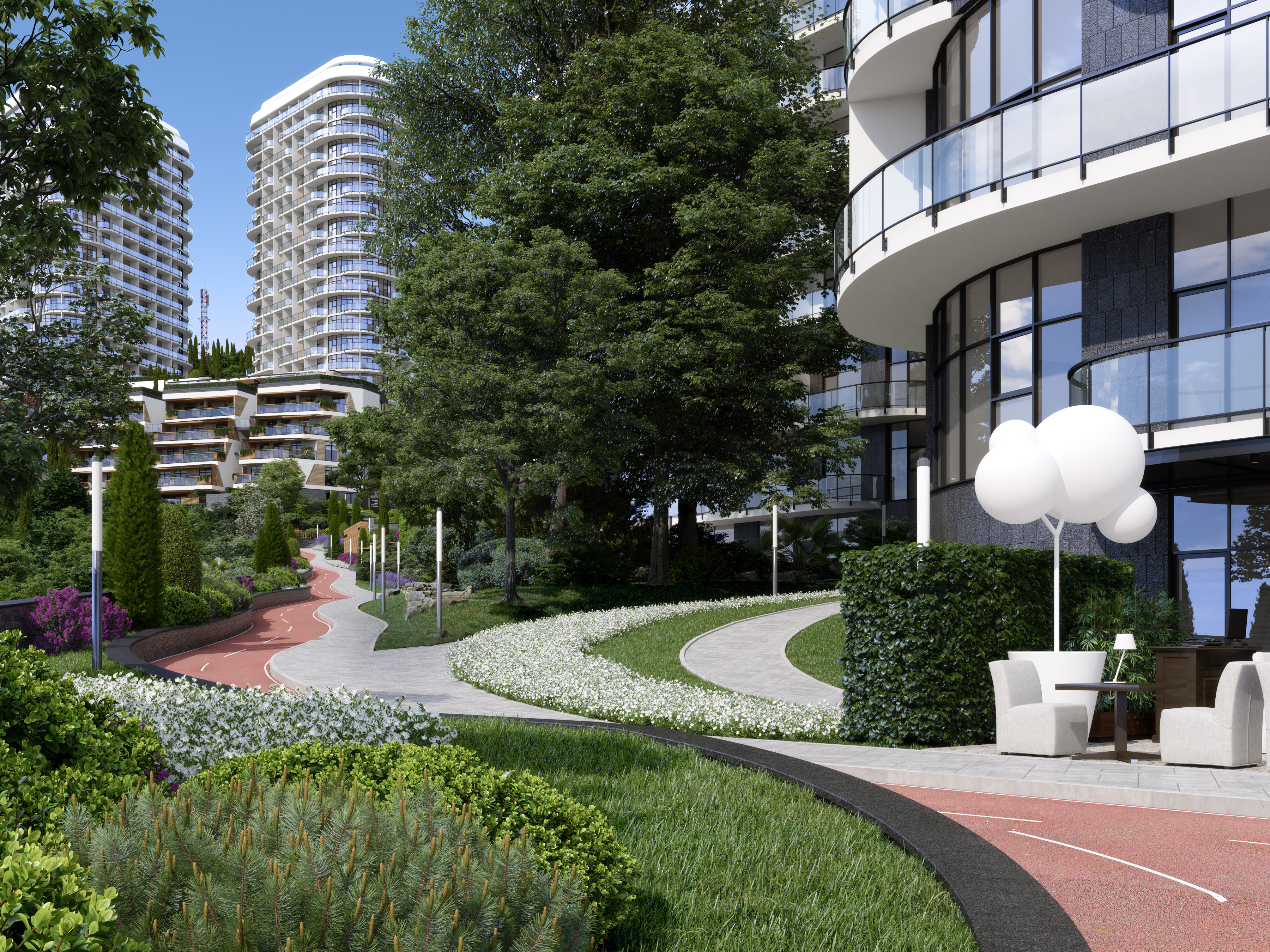 The functional wellness sculpture in the form of a six-petal tree, a large variety of ellipticals and wide selection of other sports equipment allows to get the most out of outdoor training and achieve results regardless of your skills. In addition, the Sports area was located next to the pool – to allow residents to combine ground and water activities, or to relax in the pool and hydromassage area after strength exercises, or visit the massage room located within the pool area.