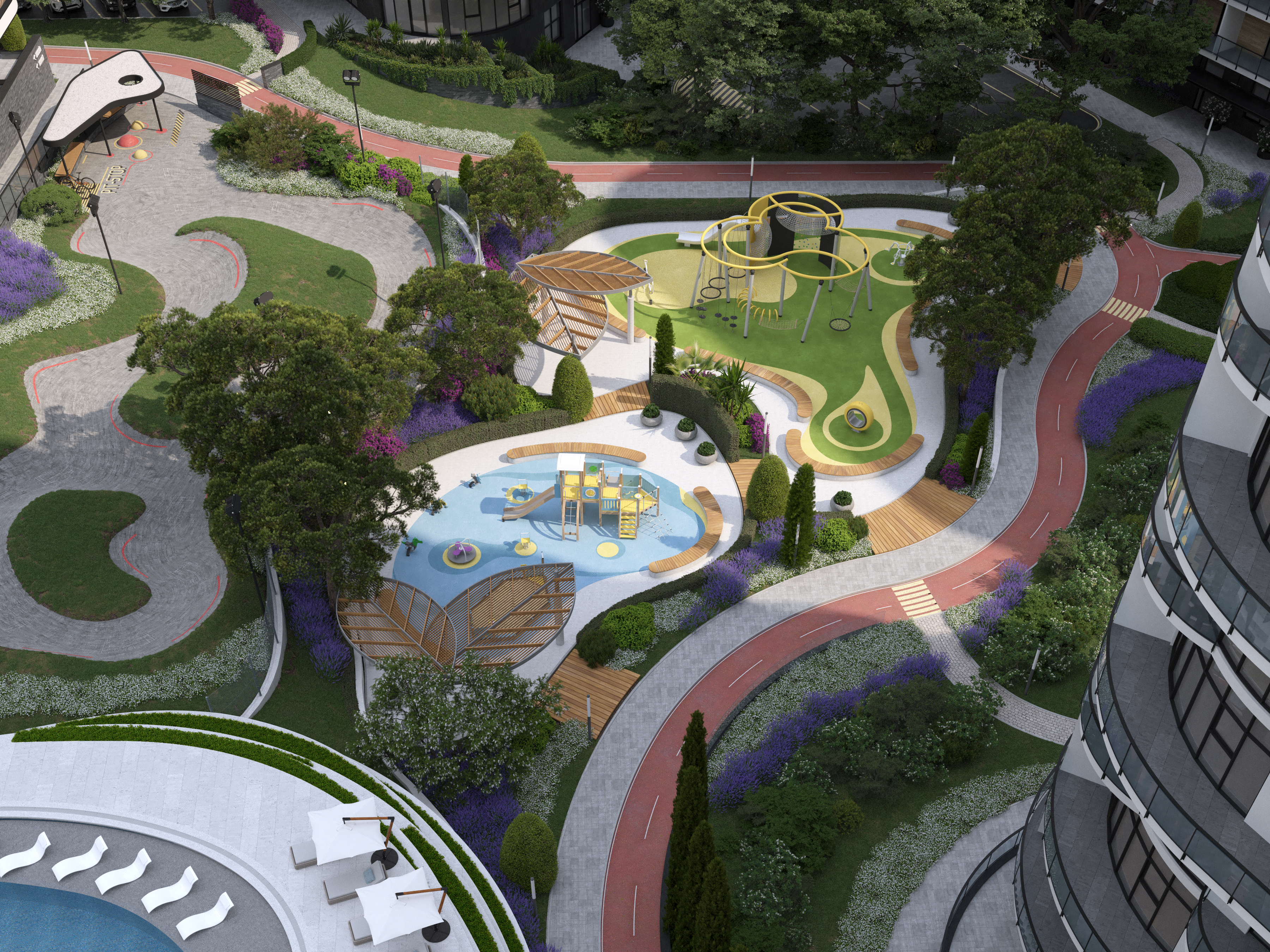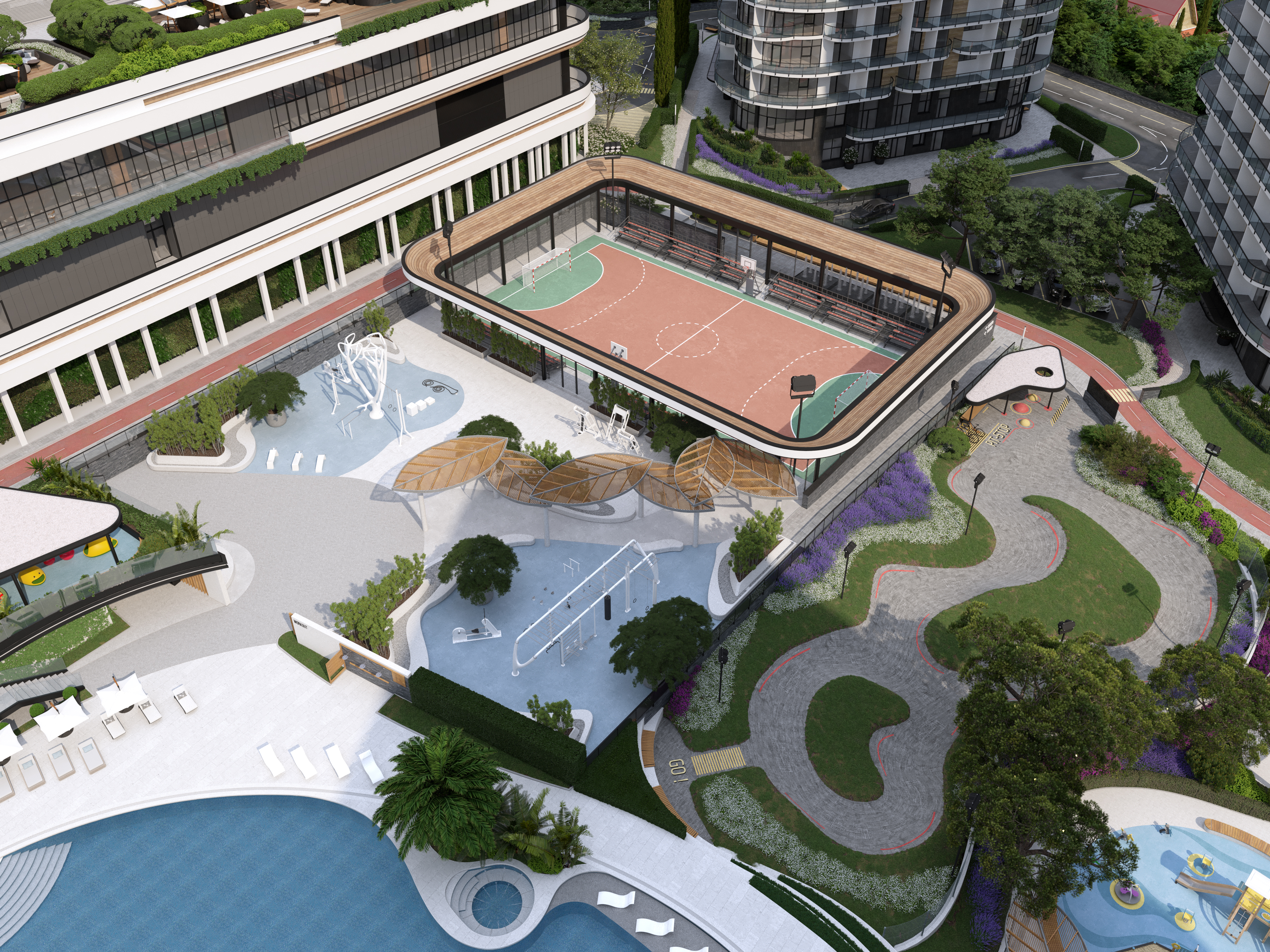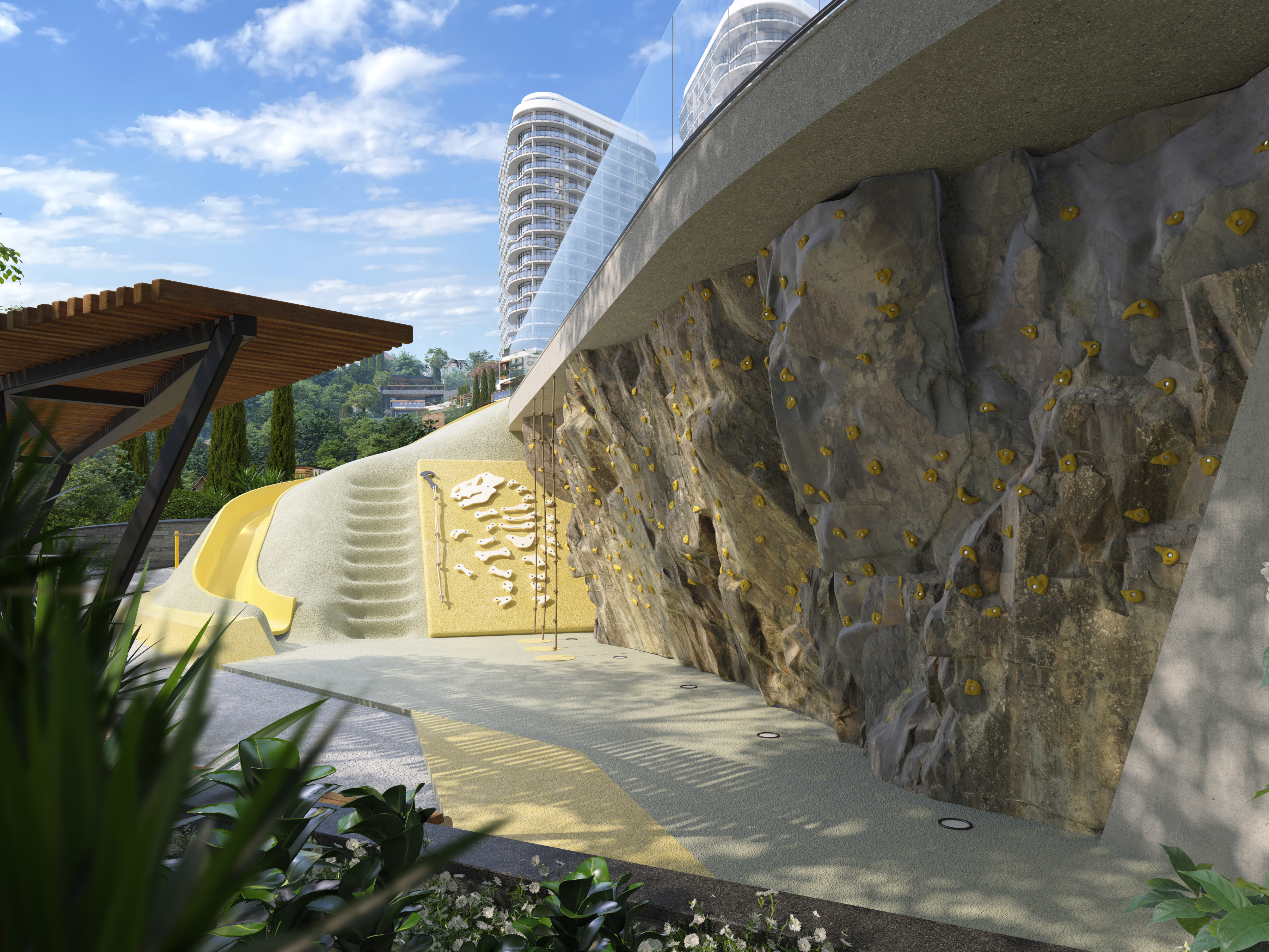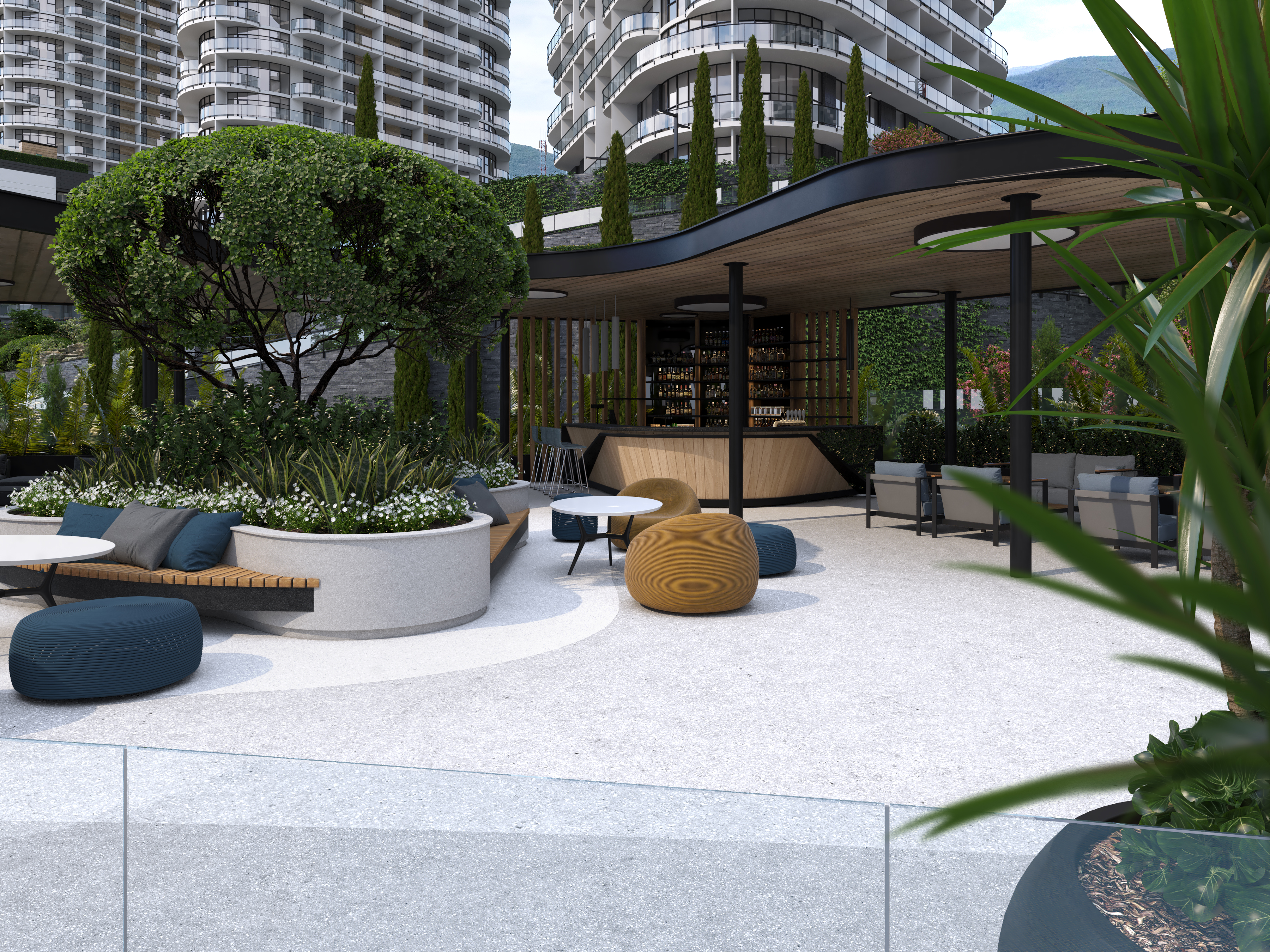 The functional wellness sculpture in the form of a six-petal tree, a large variety of ellipticals and wide selection of other sports equipment allows to get the most out of outdoor training and achieve results regardless of your skills. In addition, the Sports area was located next to the pool – to allow residents to combine ground and water activities, or to relax in the pool and hydromassage area after strength exercises, or visit the massage room located within the pool area.