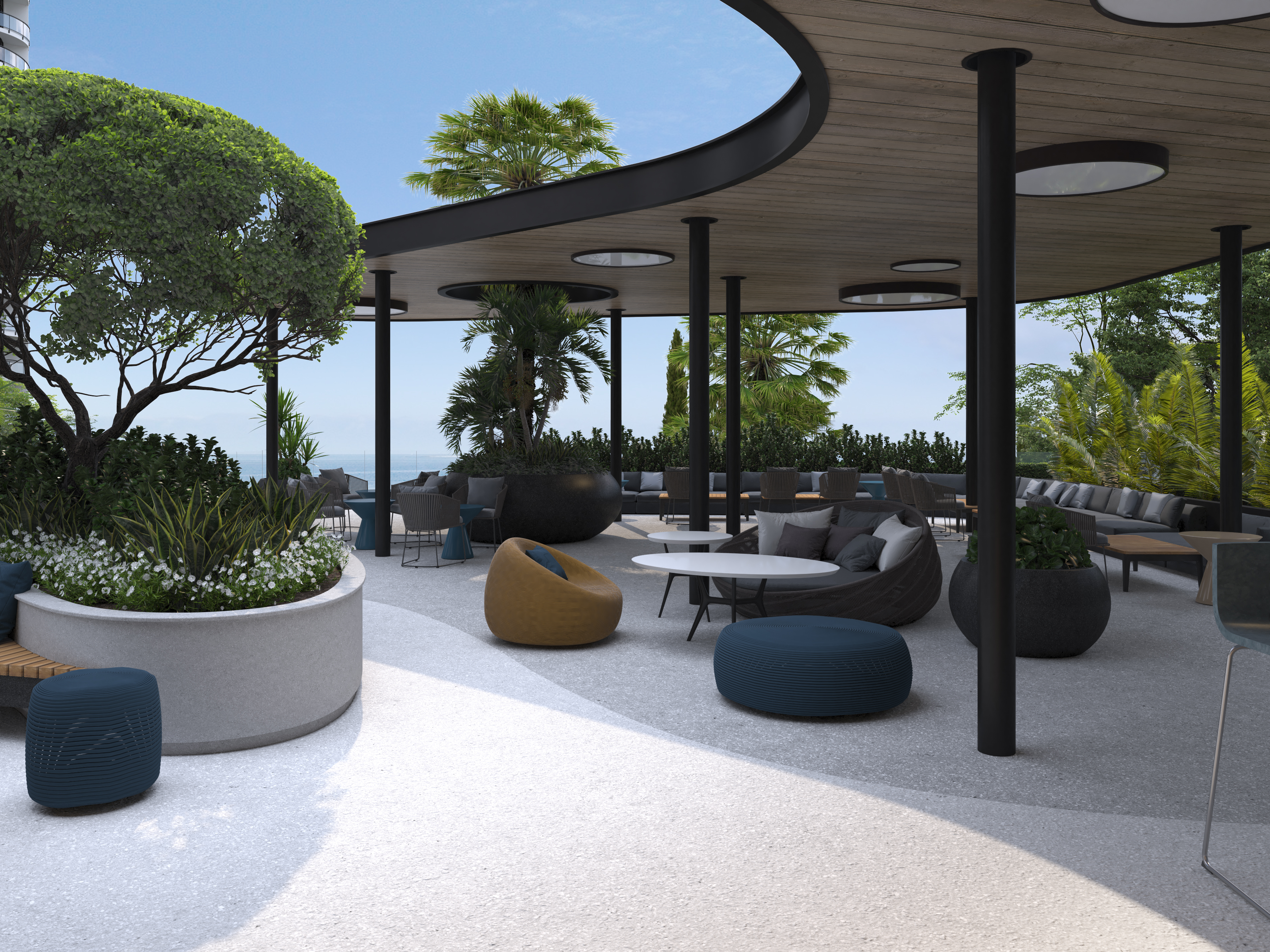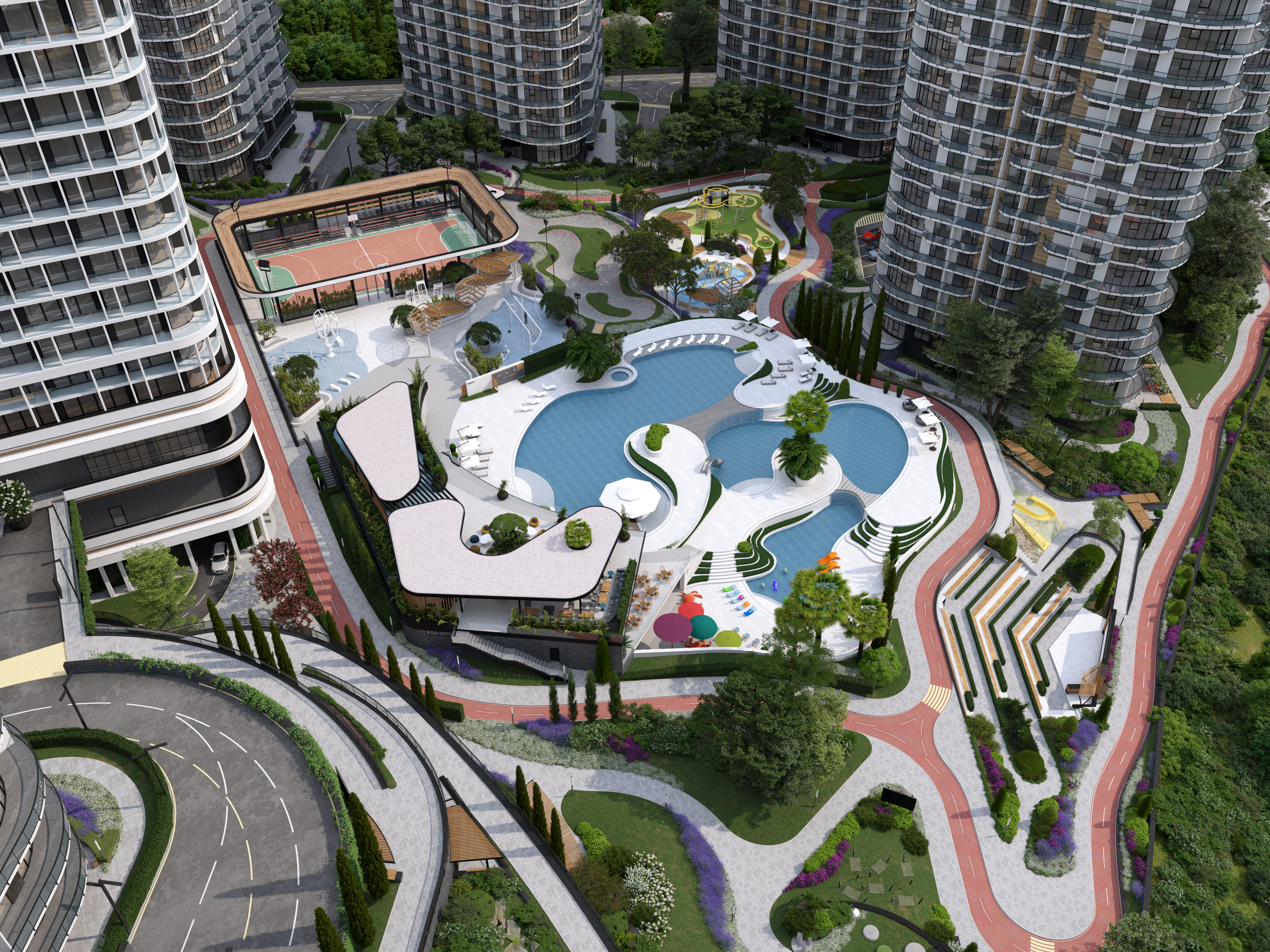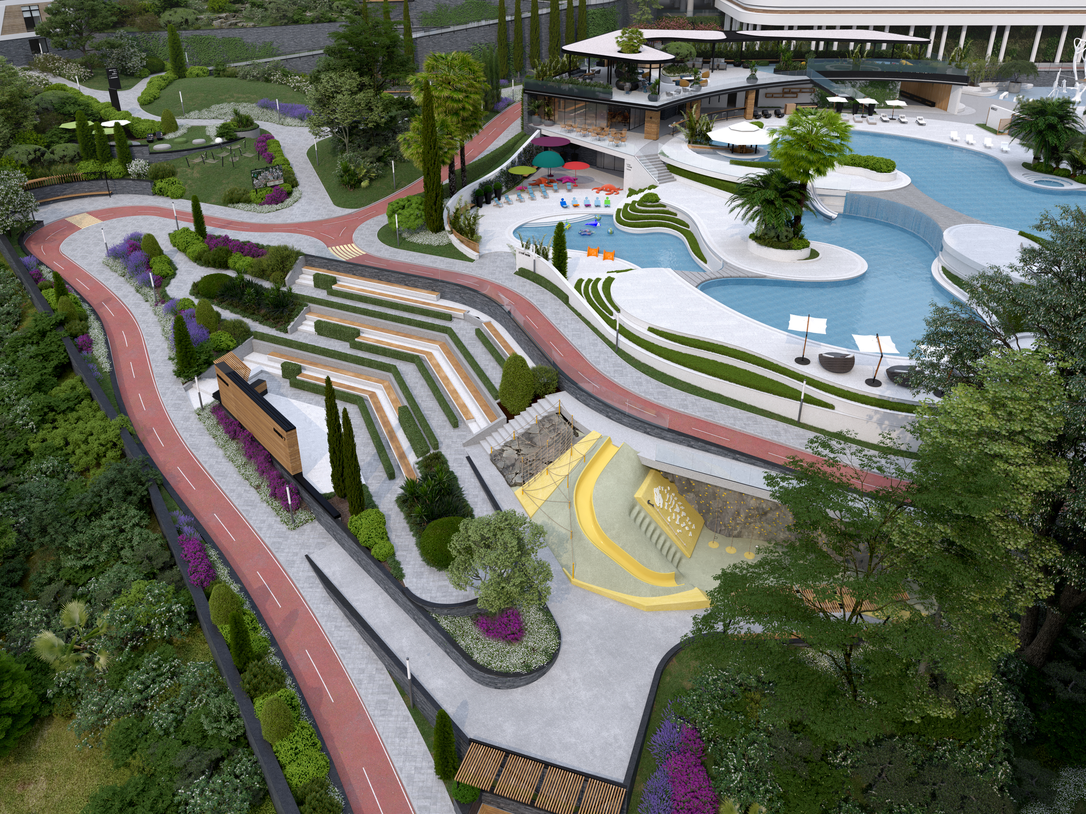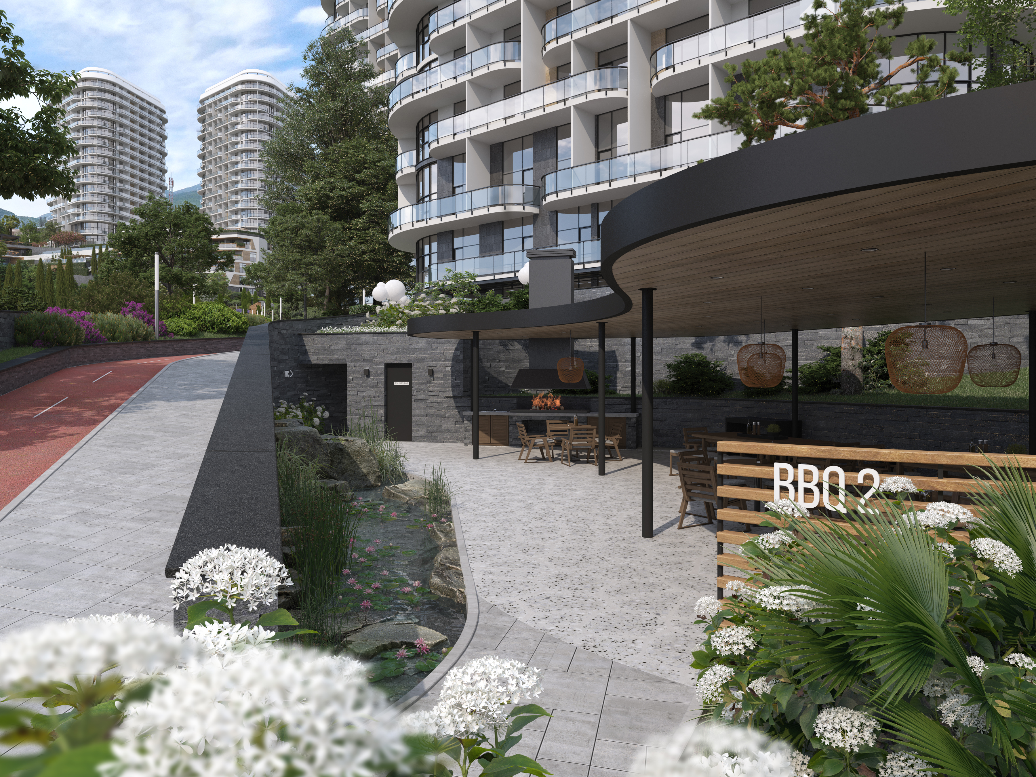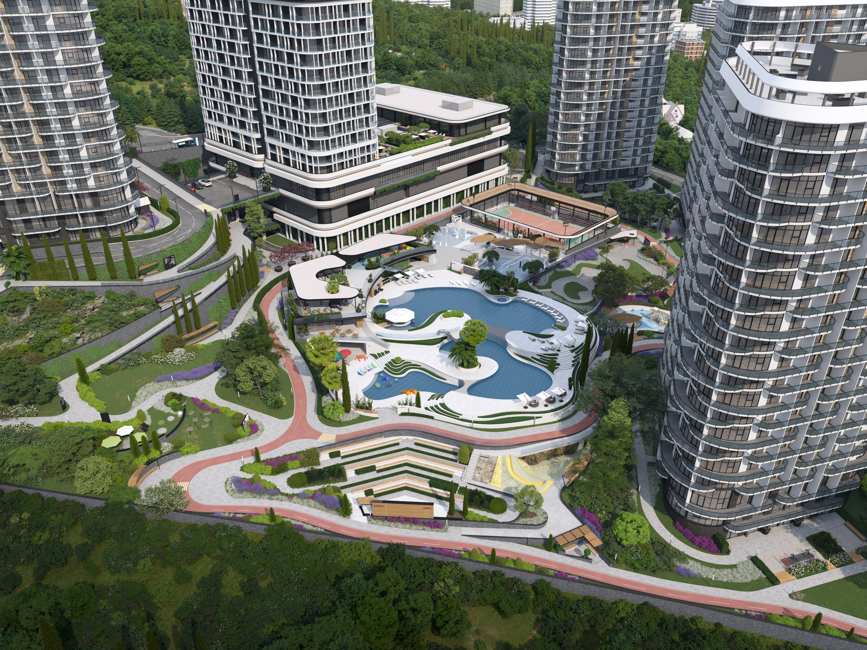 The functional wellness sculpture in the form of a six-petal tree, a large variety of ellipticals and wide selection of other sports equipment allows to get the most out of outdoor training and achieve results regardless of your skills. In addition, the Sports area was located next to the pool – to allow residents to combine ground and water activities, or to relax in the pool and hydromassage area after strength exercises, or visit the massage room located within the pool area.
