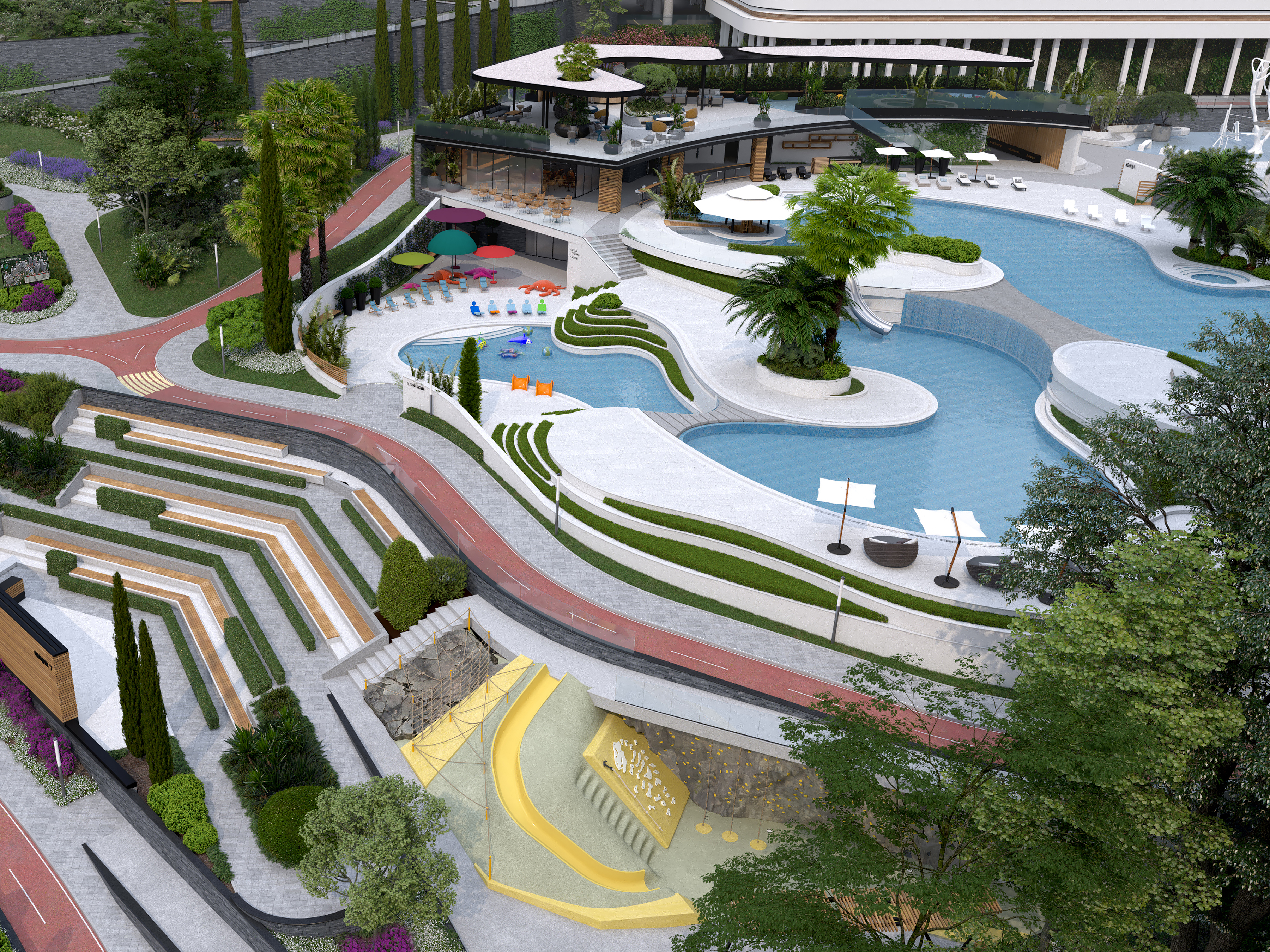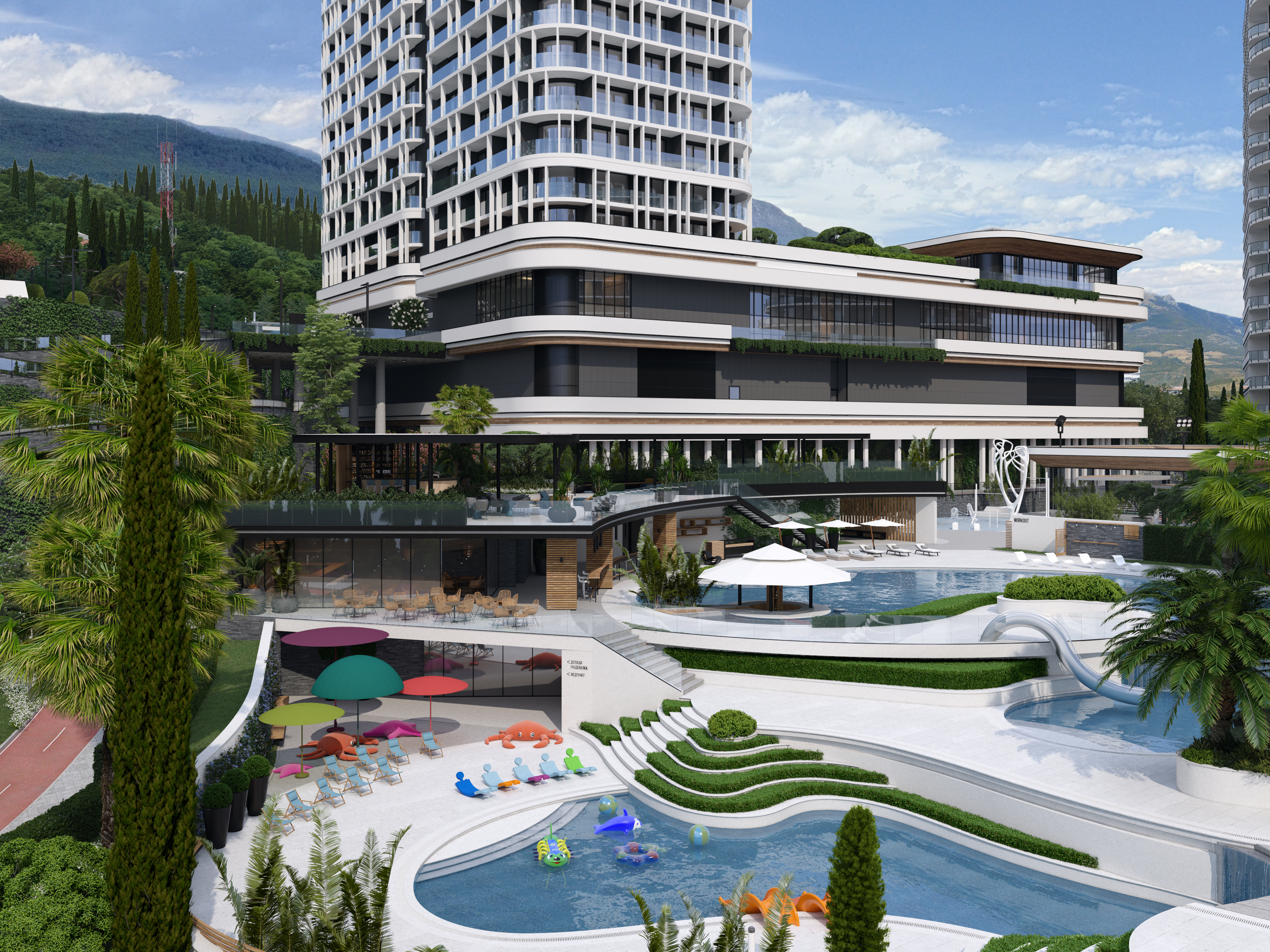 There is a three-story building next to the pool area, where all the necessary facilities are located: Locker rooms for the kids and ER on the first floor, a cafe, locking rooms for adults and massage rooms – on the second floor and a cocktail bar and kids game zone are located on the third floor. These amenities allow adults to change the environment and relax in the cafe, without leaving their kids unattended in the pool – allowing them to visit the playroom on the same floor.