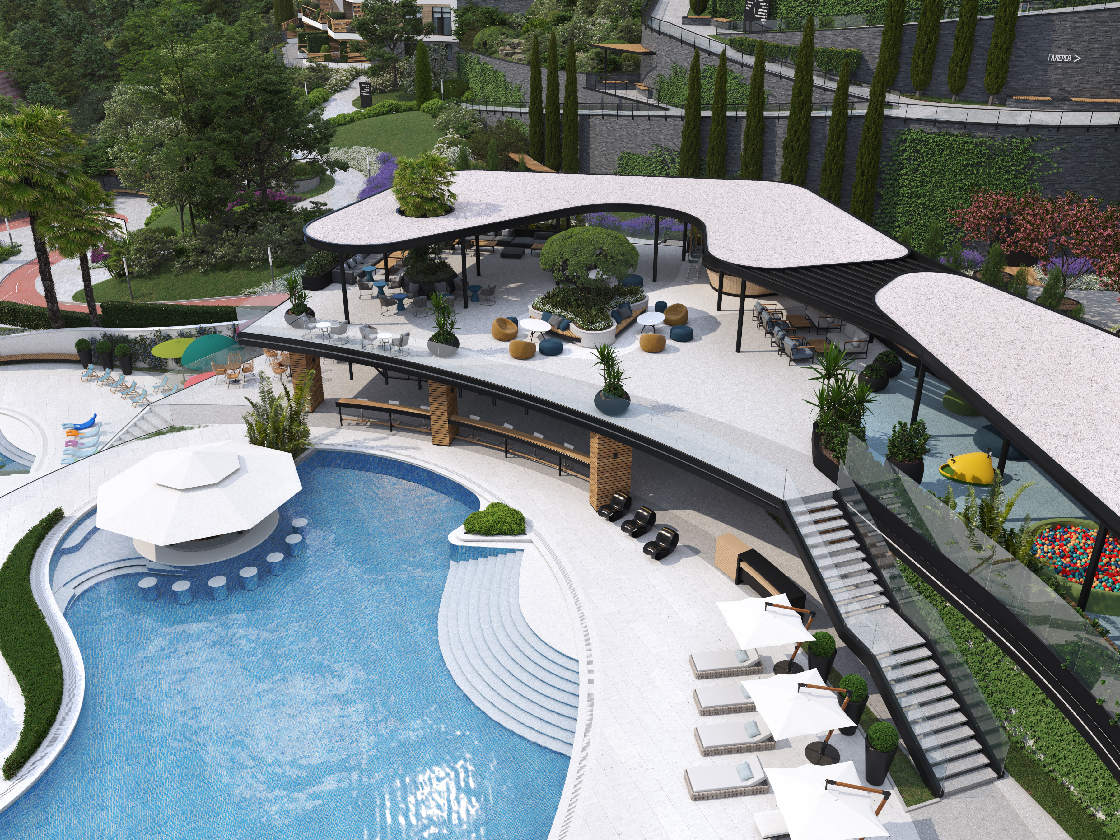 The largest of them is intended for adults and connects with a recreation area, which includes areas with various sun loungers, water-bar and the hydromassage zone. The other two pools that are smoothly merge into one another are designed for kids and teenager and equipped with water slides and kid’s sun loungers. They are located below the large pool and are fully visible from the “adults” area. Thanks to this, we were able to fully implement the concept of separate recreation areas for kids and adults. While kids are physically separated from adults, they still remain under a constant supervision of their parents, due to the construction design solution.
