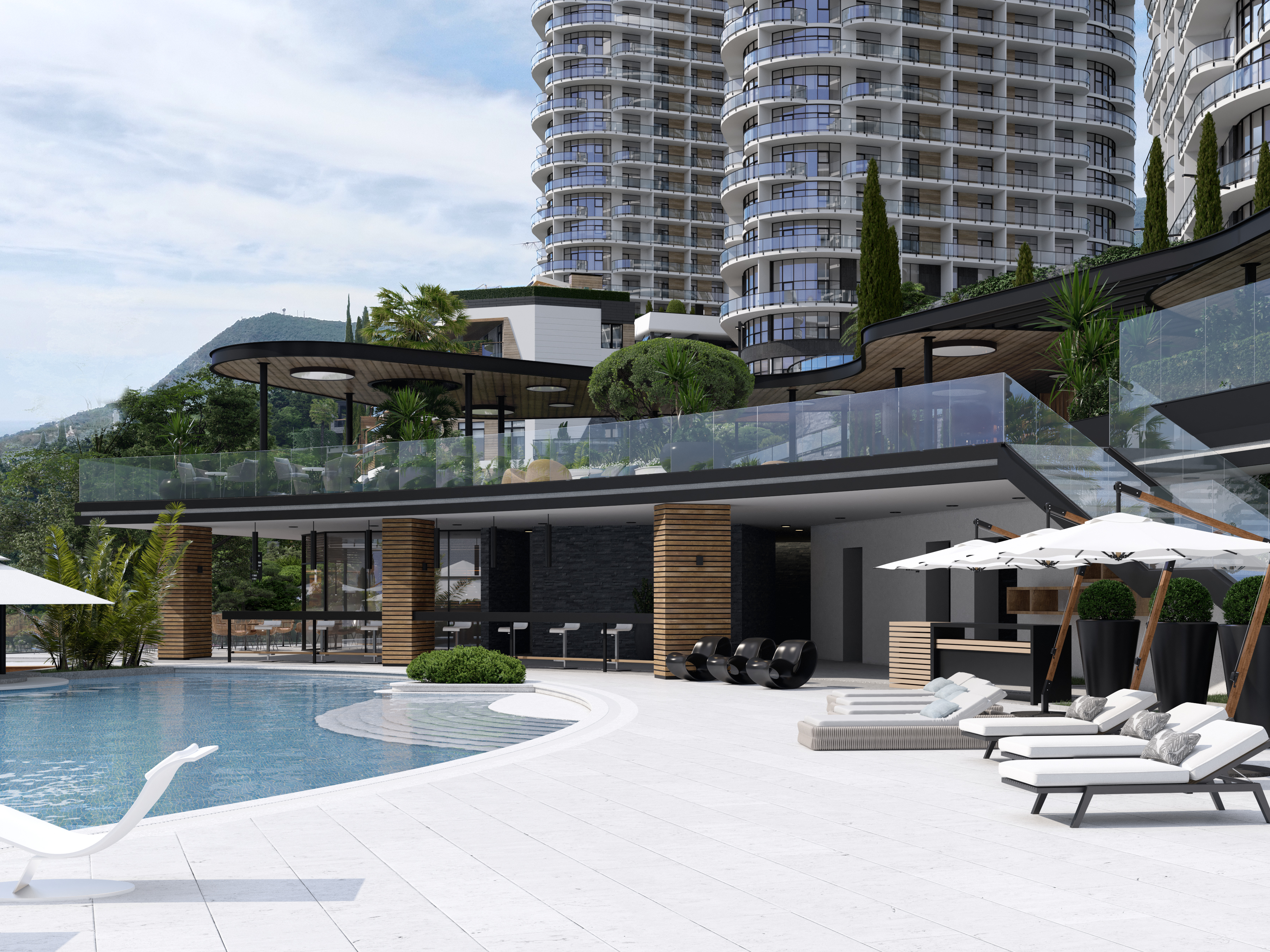 The first element to be developed was a large swimming area, combining three different-level swimming pools with a total area of ​​1000 sq.m.