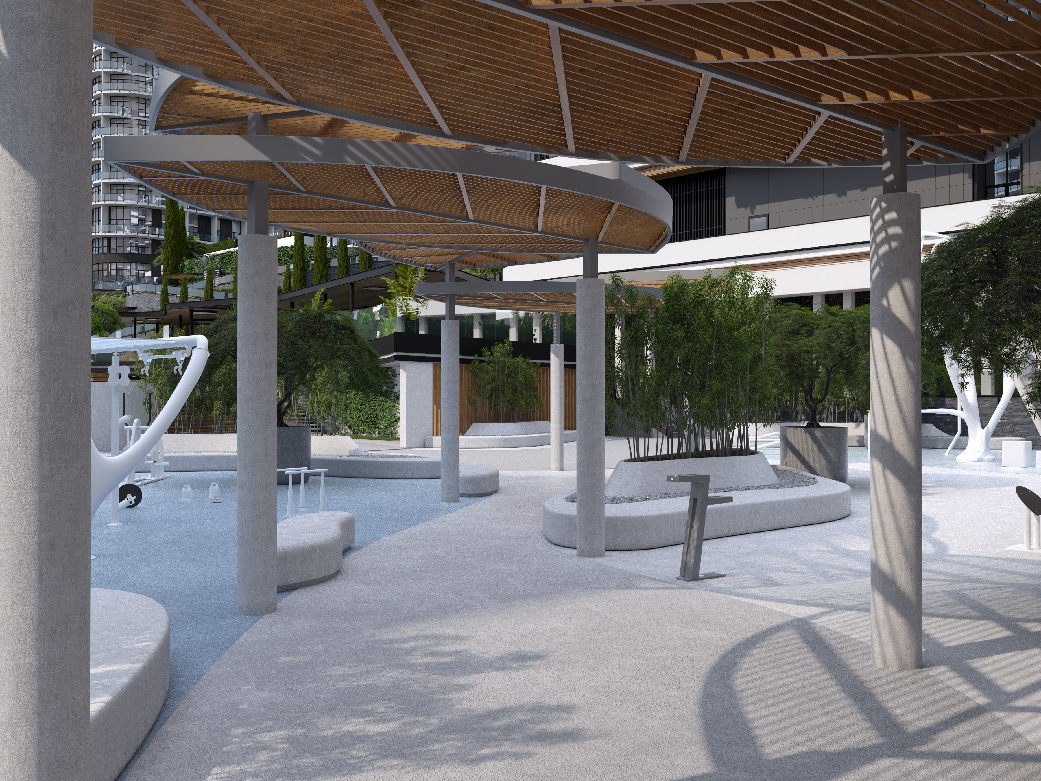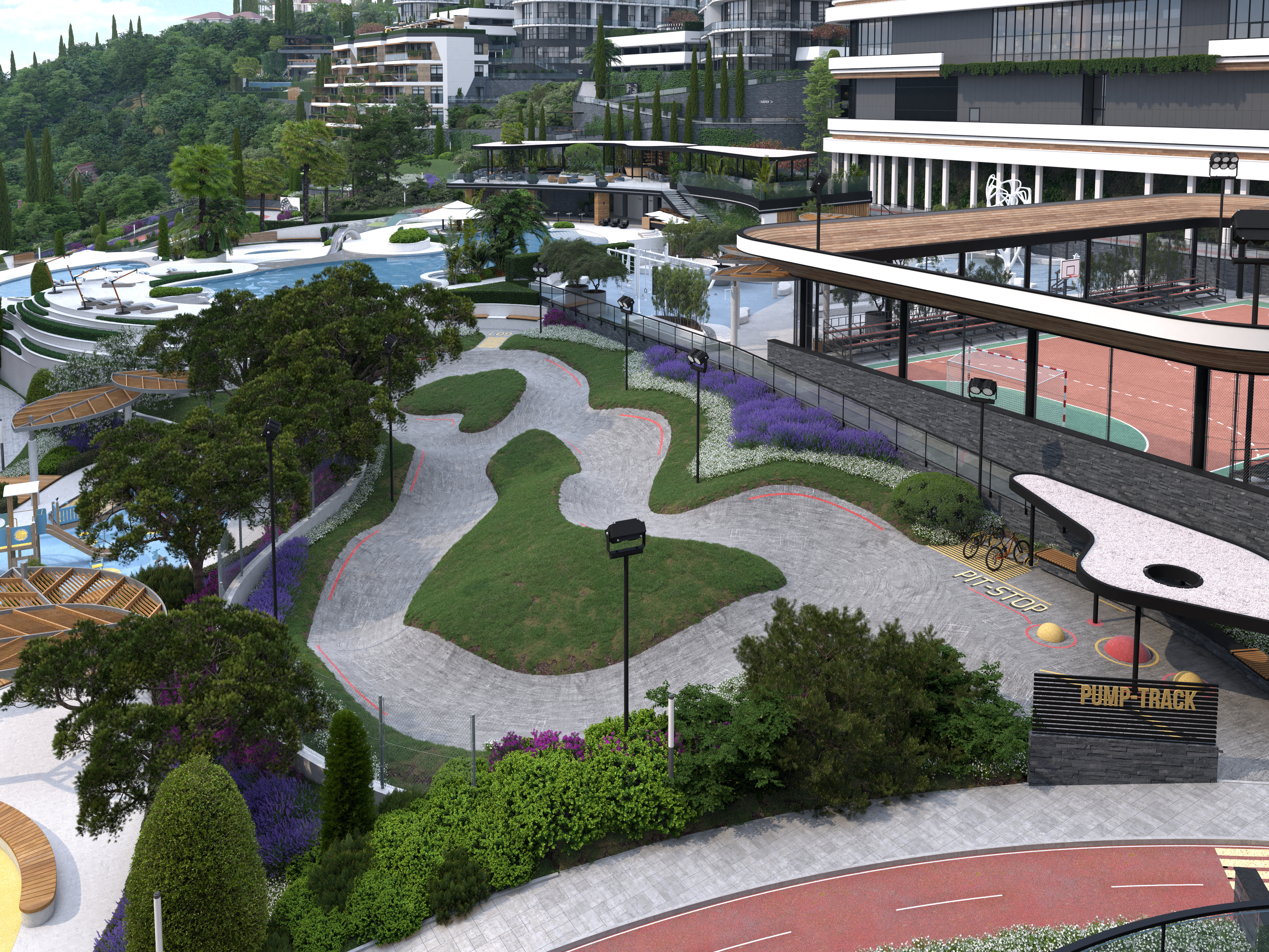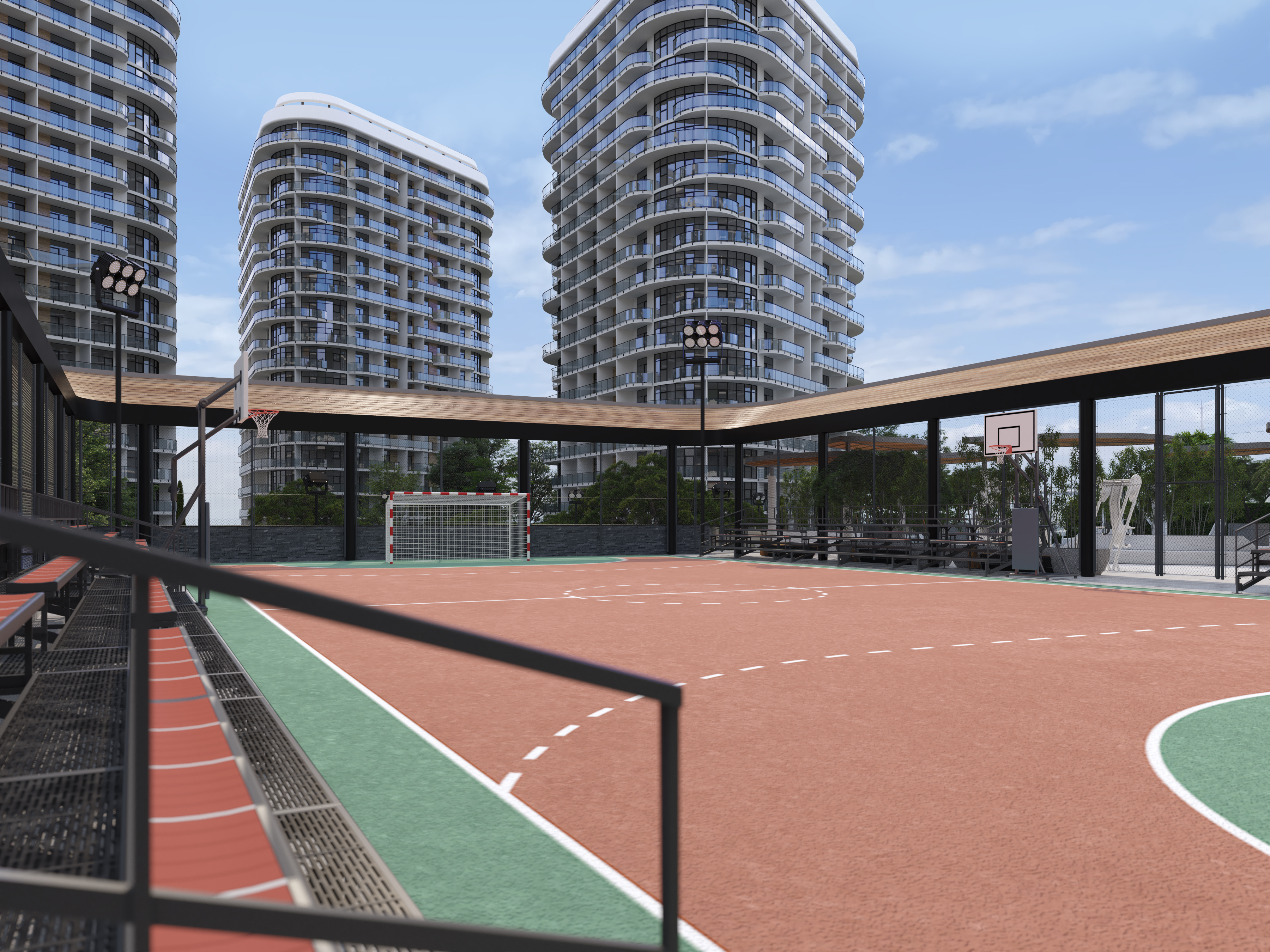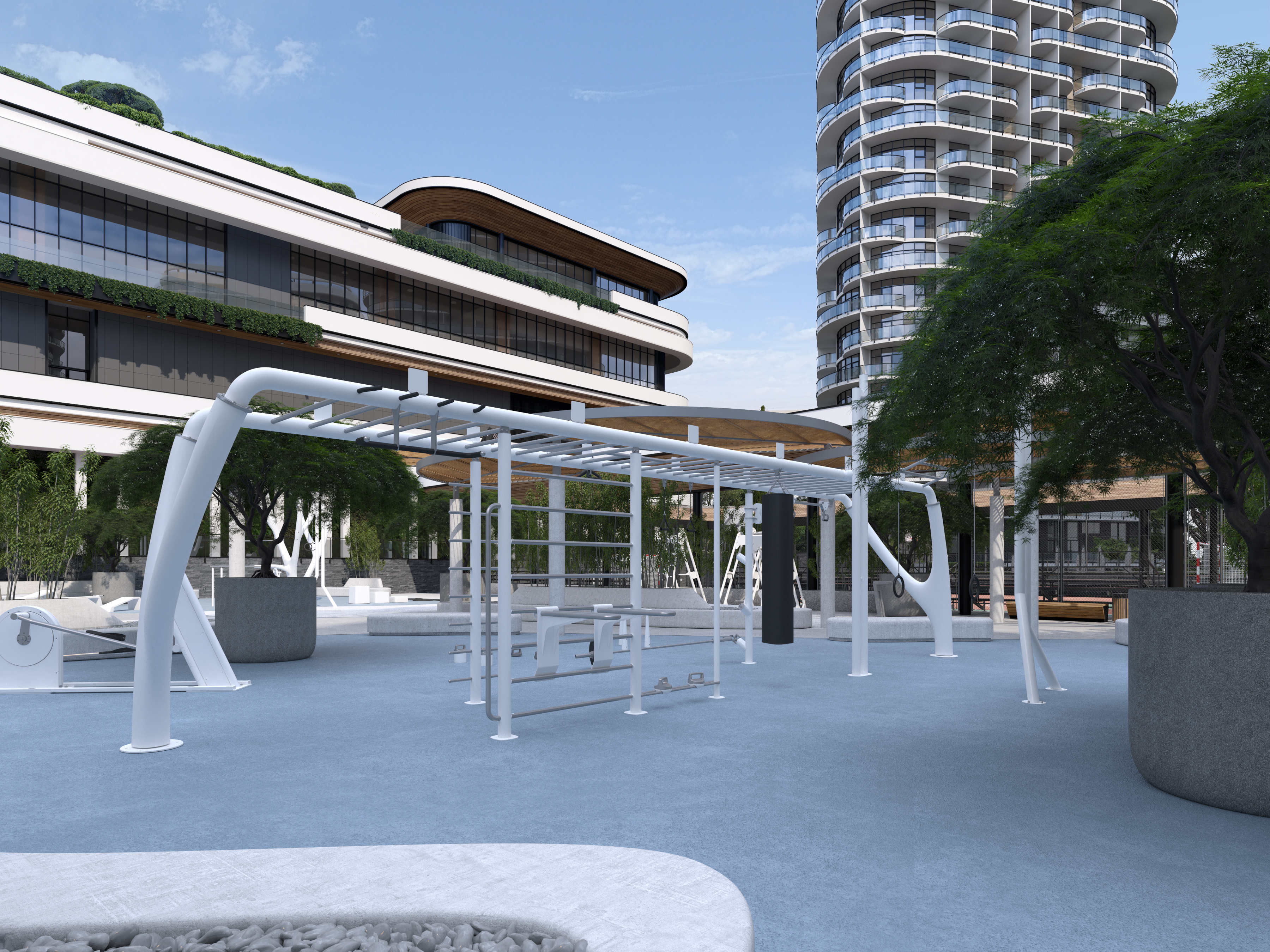 Next large common area of the project is the Sports Ground with a workout area for training and outdoor activities. The solution that allowed us to organically integrate outdoor sports into the landscape of the complex  –  became the selected gym equipment, especially sports equipment  by Italian company “My Beast Sport”, which is a real work of functional art.