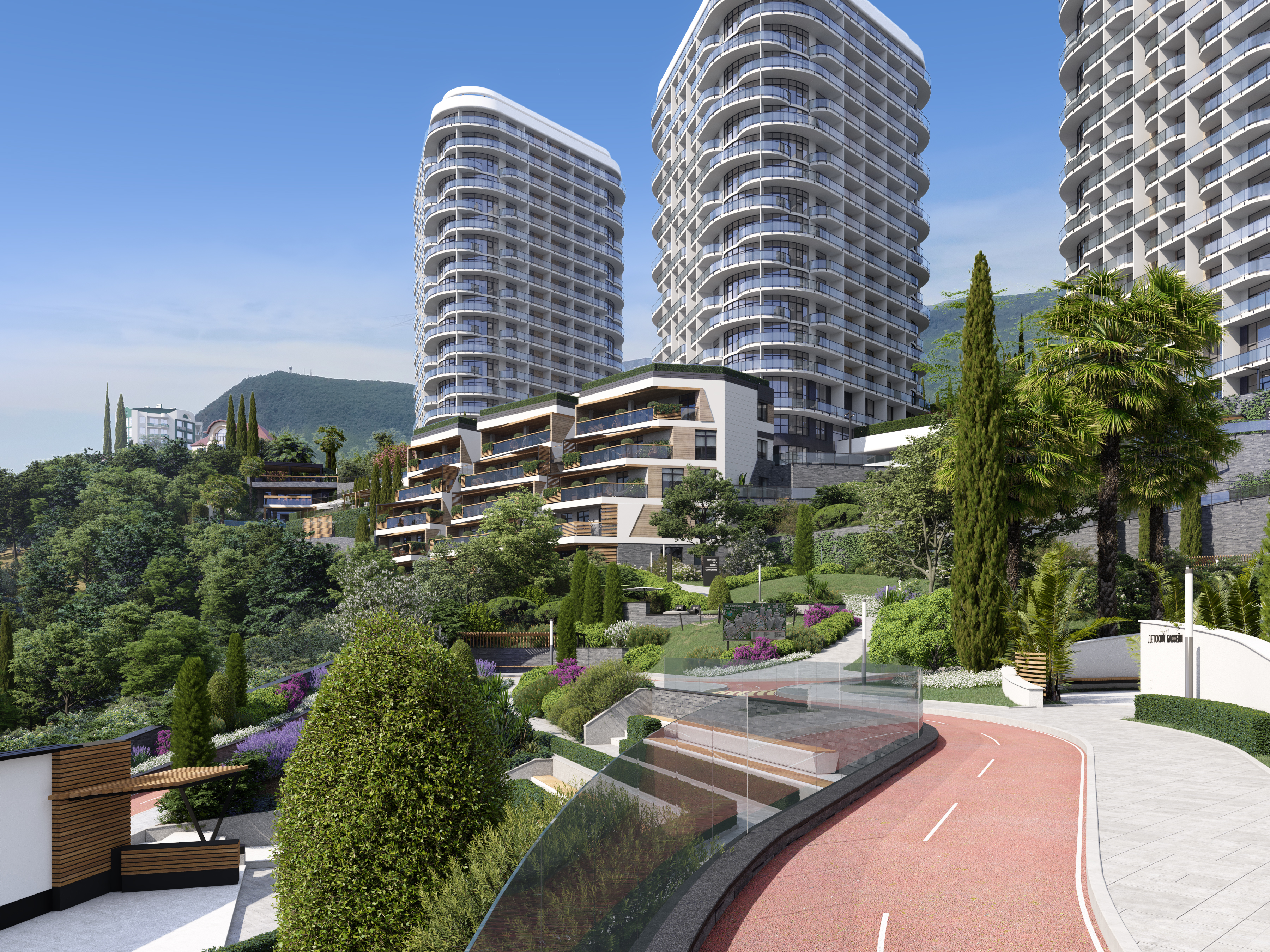 When planning the improvement elements, we not only tried to place all the necessary amenities  but also were seeking to use the features of the site as an additional advantage – to make the multi-level facility more functional and convenient for it’s residents, as well as to increase the efficiency of the territory zoning.