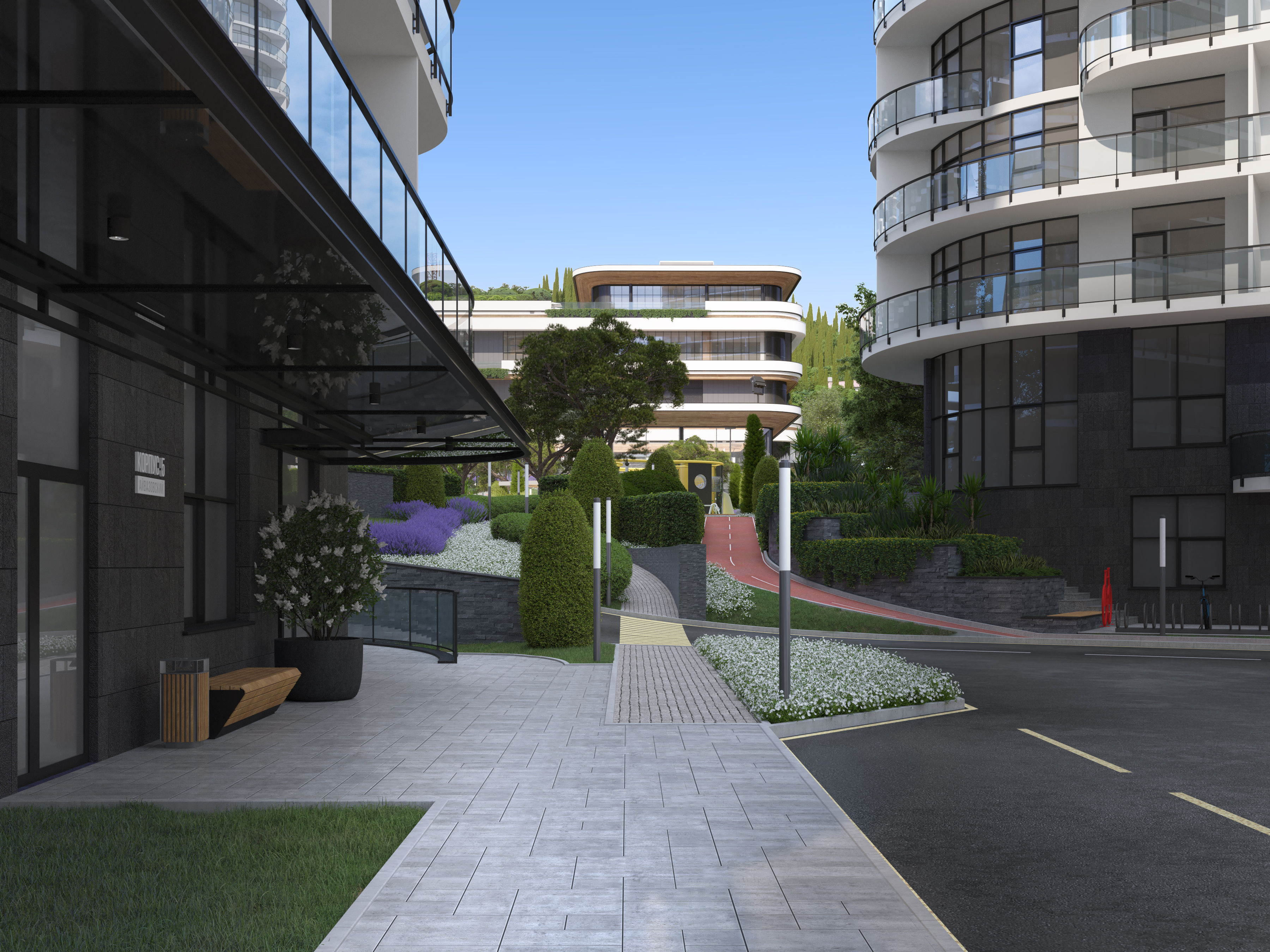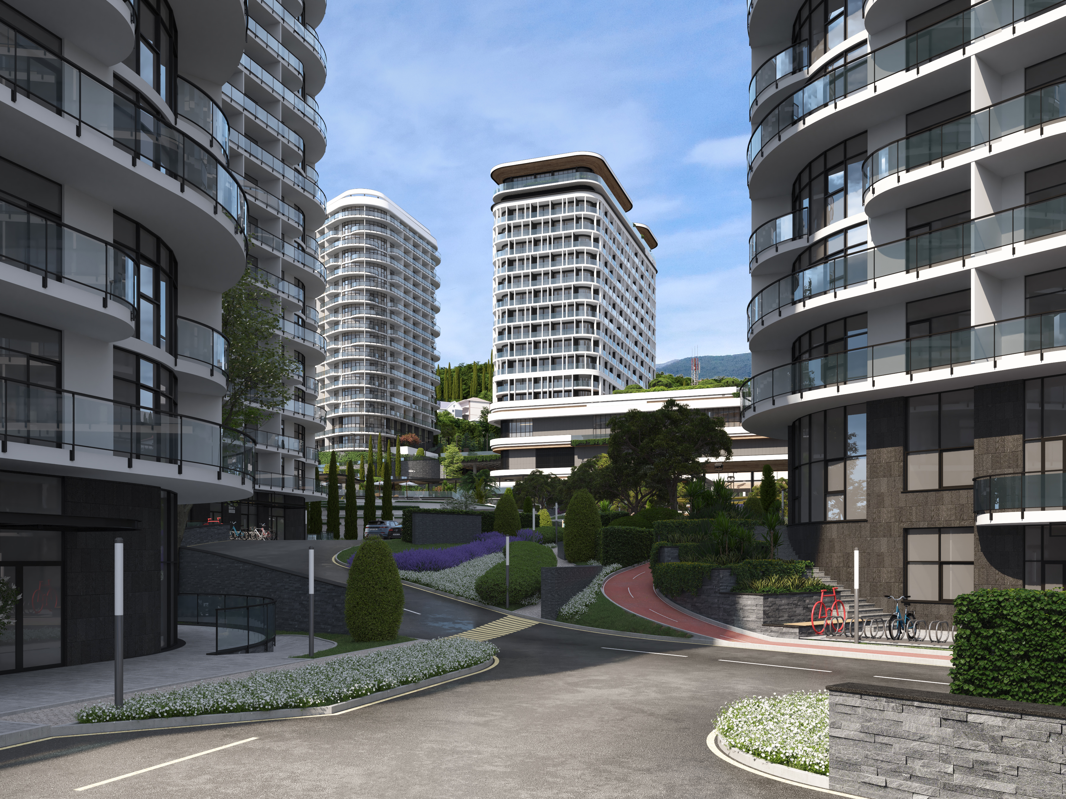 We have been particularly focusing on the cycling infrastructure – to make riding through the territory more interesting and safe: all bike paths are separated from the pedestrian zones and are provided with special coating, some of them are looped – which allows you to move around the territory without restrictions. In addition, there is a designated cycling track – a Pump track, for the kids and teenagers, located between the buildings.