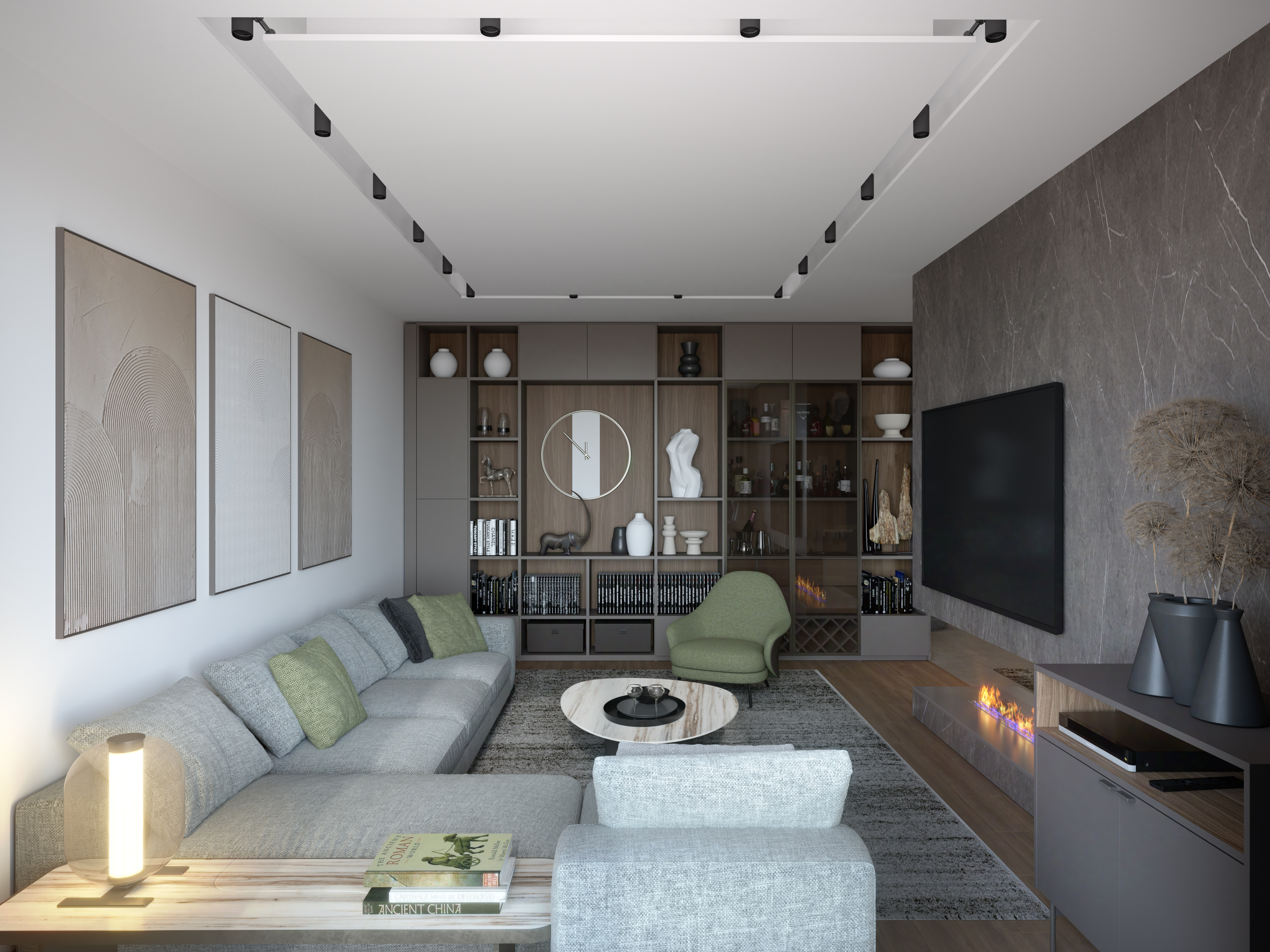 The living room is a visually isolated space with a large number of seats to relax: a coach continued by a side table and a comfortable armchair (Minotti, Italy). The upholstered furniture is complemented by a coffee table with a marble top (Giogetti, Italy), a Tv that is located above the fireplace and a credenza for the appliances.