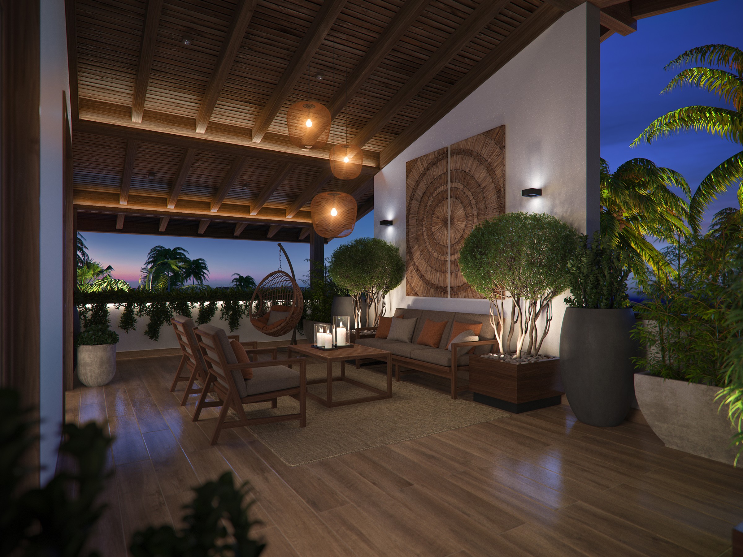 According to our project, the third level accommodates 6 spacious rooms: three “DeLuxe” ones and three “Premium” rooms. All rooms are provided with a high-quality finishing in a tropical style – emphasized by high mansard-type wood ceilings, organically following the pattern of the interior decorations. The equipment (FF&E) of the rooms was carried out by the Studio and includes everything necessary for the comfort of the guests: large comfortable canopy-beds, full set of furniture – made of walnut tree; spacious bathrooms – meeting the highest international standards for hotels.